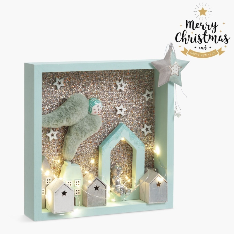 Ξύλινη χριστουγεννιάτικη τετράγωνη κορνίζα σε παλ βεραμάν χρώμα με θέμα "Η νύχτα των αγγέλων". To φόντο είναι στολισμένο με πολύχρωμο μεταλλιζέ χρώμα και ξύλινα αστεράκια. Η κορνίζα είναι διακοσμημένη με γούνινα φτερά αγγέλου σε βεραμάν χρώμα, ξύλινα σπιτάκια σε βεραμάν-γκρι αποχρώσεις. Στο επάνω μέρος της κορνίζας το μεταλλικό αστέρι-γούρι ολοκληρώνει μια κλασσική και ταυτόχρονα μοντέρνα επιλογή για το πιο ξεχωριστό δώρο στους αγαπημένους σας. Συνοδεύεται από φωτάκια led που λειτουργούν με μπαταρίες (3 τεμάχια ΑΑ).