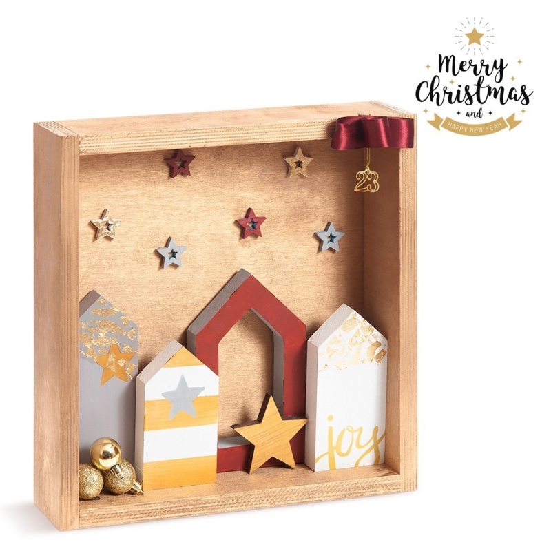 Ξύλινη τετράγωνη κορνίζα σε χρυσό χρώμα με θέμα Η χριστουγεννιάτικη πολιτεία. Στην κορνίζα είναι τοποθετημένα ζωγραφιστά σπιτάκια και αστεράκια σε γήινες και χρυσές αποχρώσεις.