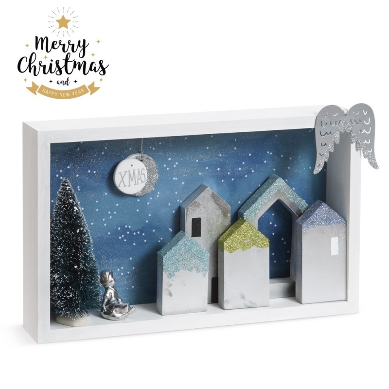 Ξύλινη τετράγωνη κορνίζα σε λευκό χρώμα με θέμα "Χριστουγεννιάτικη μαγική νύχτα με φεγγάρι". Στο φόντο βλέπουμε ζωγραφισμένο τον έναστρο ουρανό με το ασημένιο φεγγάρι. Η κορνίζα είναι διακοσμημένη με ασημί σπιτάκια, χριστουγεννιάτικο δέντρο και πορσελάνινο διακοσμητικό αγοράκι. Τα ασημί μεταλλικά φτερά στο πάνω μέρος της κορνίζας ολοκληρώνουν μια τέλεια χριστουγεννιάτικη πρόταση για δώρο.