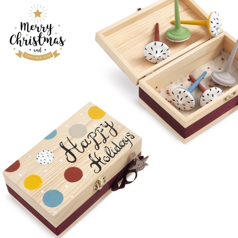 Χριστουγεννιάτικο σετ δώρου σε ξύλινο natural κουτί. Το καπάκι είναι ζωγραφισμένο με τη φράση Happy holidyas και μέσα περιλαμβάνει 6 ζωγραφιστές σβούρες.