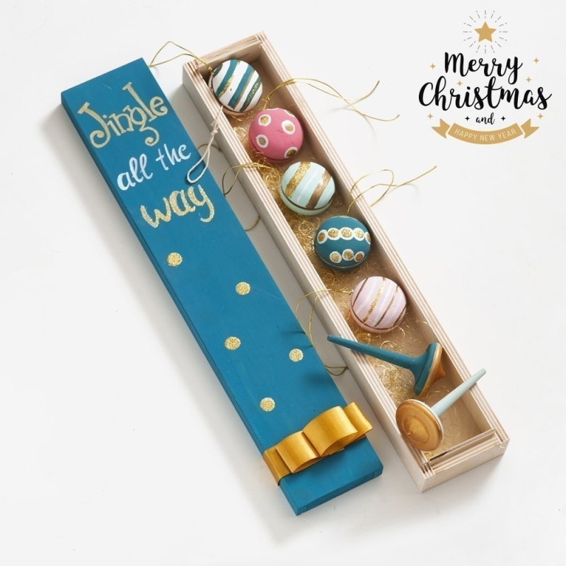 Χριστουγεννιάτικο σετ δώρου σε ξύλινο κουτί. Το καπάκι είναι ζωγραφισμένο με την φράση Jingle all the way και χρυσά πουά. Μέσα περιλαμβάνει 5 ζωγραφιστά γιο-γιο στολίδια και 2 ζωγραφιστές σβούρες.