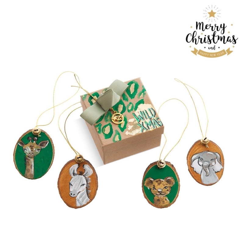 Χριστουγεννιάτικο σετ δώρου σε χάρτινο κουτί ''Wild xmas''. Μέσα περιλαμβάνει 4 ξύλινους ζωγραφιστούς κορμούς στολίδια με ζώα της ζούγκλας στολισμένα με κουδουνάκια.