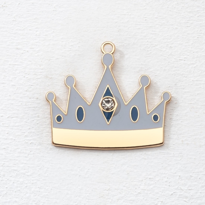 Μεταλλική κρεμαστή διακοσμητική κορώνα σε χρυσό χρώμα με σμάλτο γκρι-σιέλ και στρας. Κατάλληλο για διακοσμήσεις και χειροποίητες κατασκευές. Η συσκευασία περιέχει 10 τεμάχια.