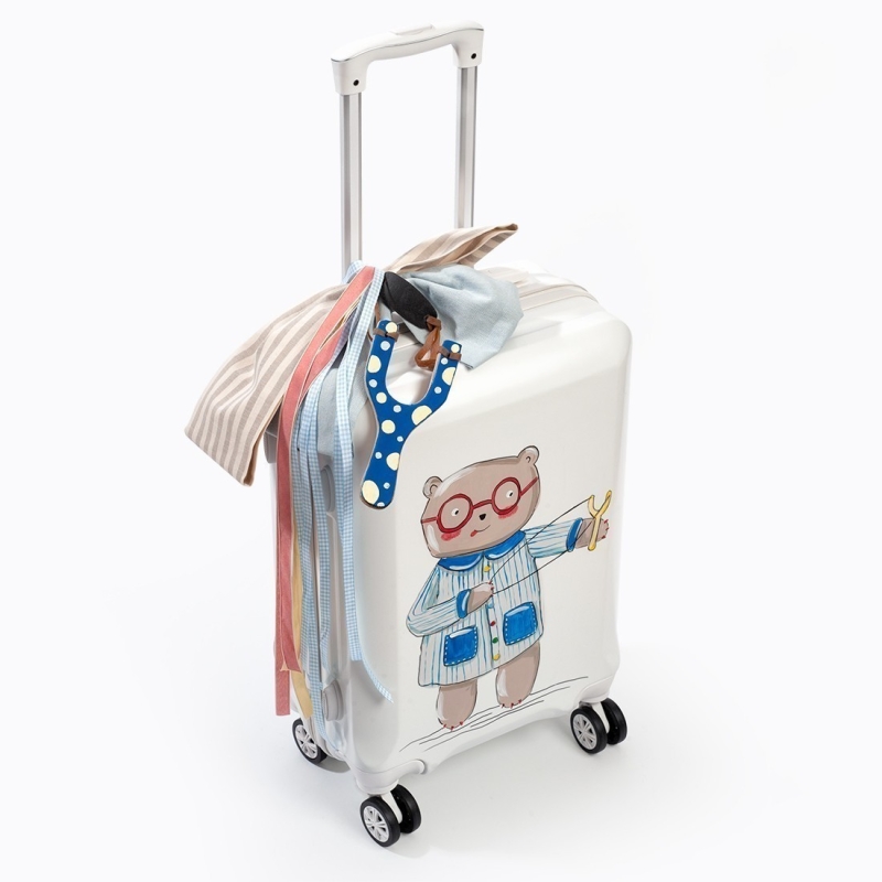 Ζωγραφιστή βαλίτσα trolley για βαπτιστικά σε άσπρο γυαλιστερό χρώμα. Το θέμα της βάπτισης είναι το αρκουδάκι αγοράκι που παίζει με την σφεντόνα του. Το χρώμα που κυριαρχεί είναι το γαλάζιο. Στο πάνω μέρος ο υφασμάτινος φιόγκος, οι πολύχρωμες κορδέλες και η ξύλινη σφεντόνα, προσθέτουν μια μοντέρνα διακόσμηση.