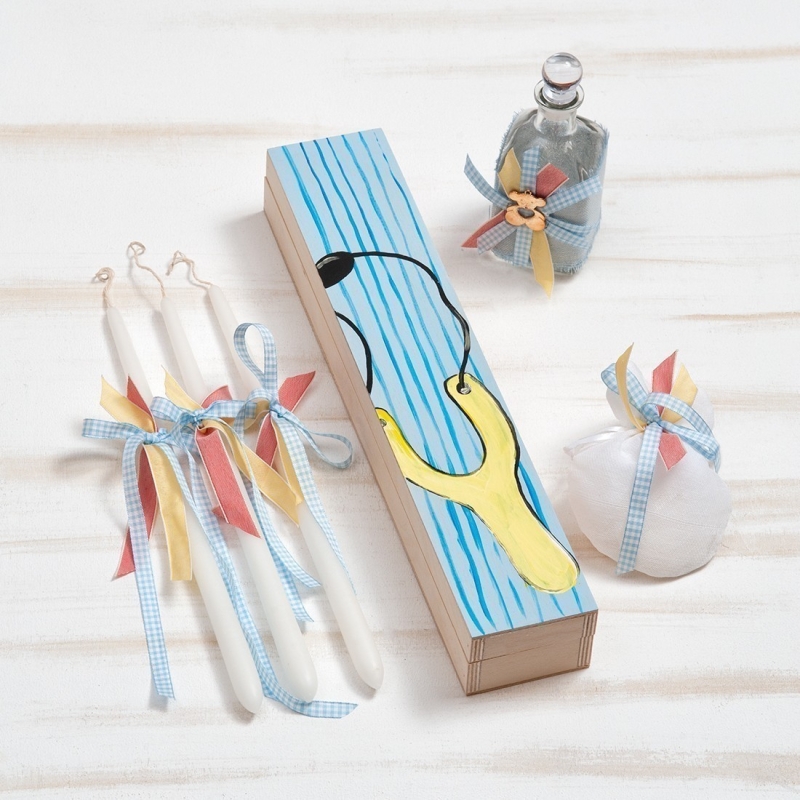 Ξύλινο κουτί συσκευασίας παραλληλόγραμμο σε σιέλ-μπλε αποχρώσεις, ζωγραφισμένο με κίτρινη σφεντόνα. Ο κωδικός περιλαμβάνει στολισμένα 3 κεράκια, σαπούνι μέσα σε πουγκί και μπουκαλάκι λαδιού.