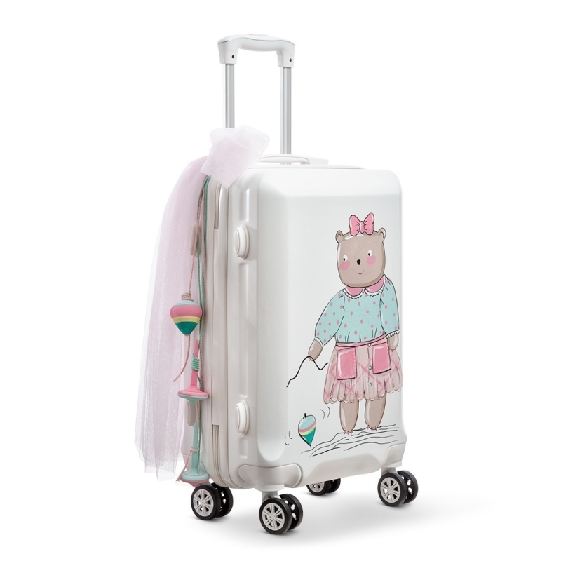Ζωγραφιστή βαλίτσα trolley για βαπτιστικά σε άσπρο γυαλιστερό χρώμα. Το θέμα της ζωγραφικής είναι το αρκουδάκι κοριτσάκι που παίζει με την σβούρα της. Το χρώμα που κυριαρχεί είναι το ροζ. Το πάνω μέρος της βαλίτσας διακοσμεί τούλι και ξύλινες πολύχρωμες σβούρες.