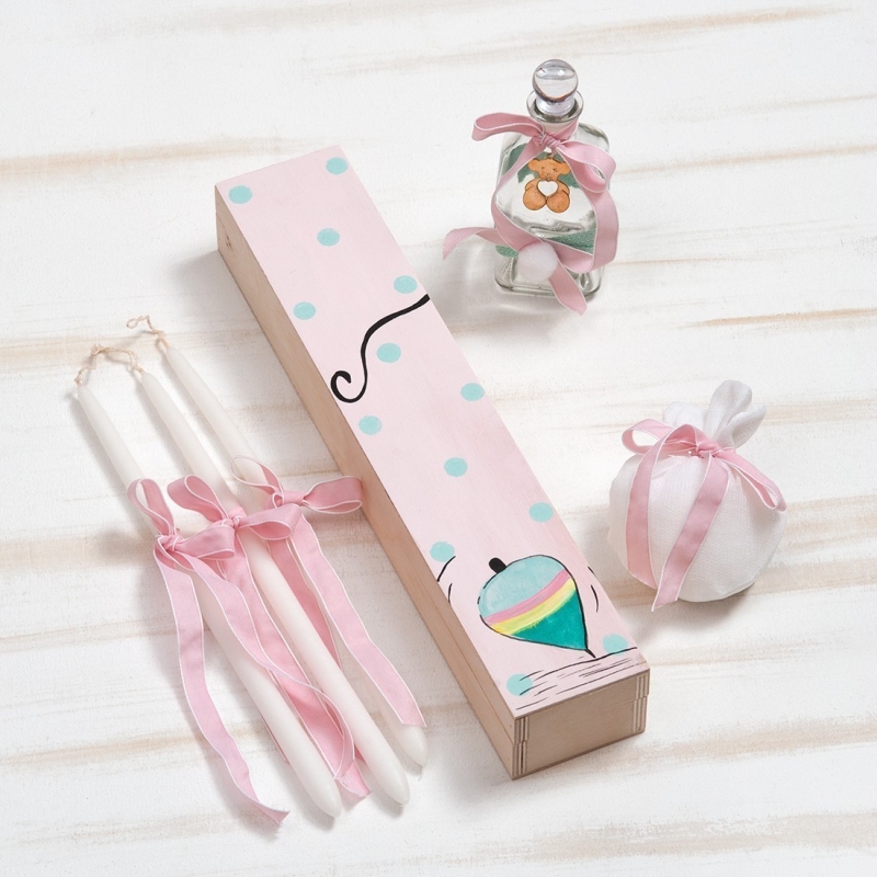 Ξύλινο κουτί συσκευασίας παραλληλόγραμμο σε ροζ αποχρώσεις, ζωγραφισμένο με πολύχρωμη σβούρα. Ο κωδικός περιλαμβάνει στολισμένα 3 κεράκια, σαπούνι μέσα σε πουγκί και μπουκαλάκι λαδιού.