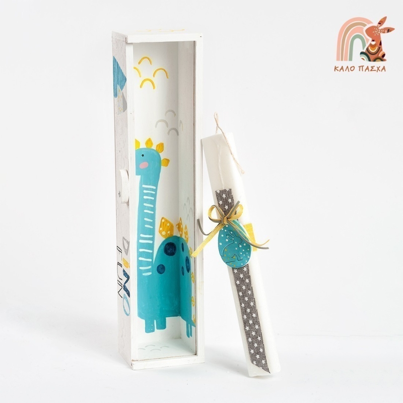 Πασχαλινό σετ δώρου με θέμα το δεινοσαυράκι. Το πασχαλινό δωράκι περιλαμβάνει: 1) το ξύλινο κουτί ζωγραφισμένο με δεινοσαυράκι σε βεραμάν απόχρωση 2) τη λαμπάδα η οποία είναι διακοσμημένη με ύφασμα print με λευκά αστέρια και ξύλινο διακοσμητικό λαγουδάκι σε σχήμα αυγού