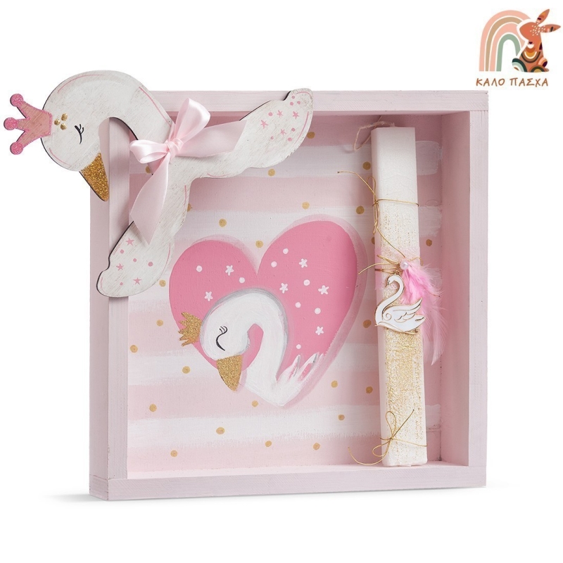 Ξύλινη πασχαλινή κορνίζα σετ δώρου με θέμα το ροζ κύκνο. Στο σετ περιλαμβάνεται η πασχαλινή λαμπάδα