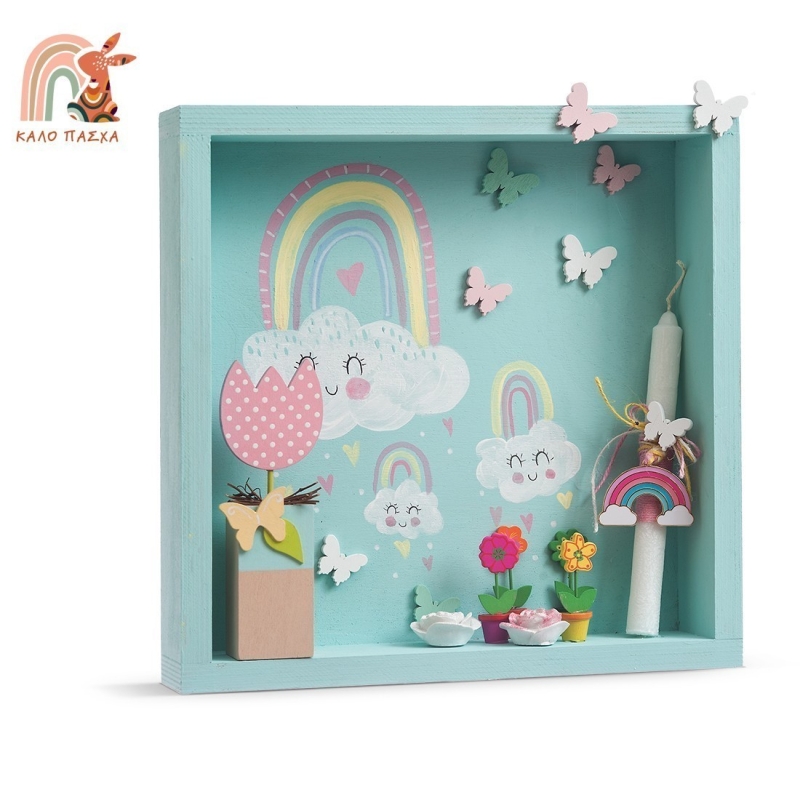 Ξύλινη πασχαλινή κορνίζα σετ δώρου με θέμα Ουράνιο τόξο-Μια όμορφη μέρα. Στο σετ περιλαμβάνεται η πασχαλινή λαμπάδα