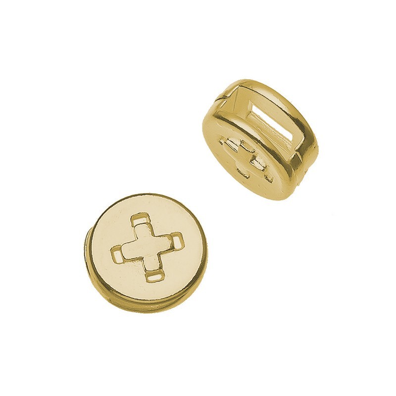 Μεταλλικό χυτό σταυρουδάκι για περαστή κορδέλα για κατασκευές μαρτυρικών, σε χρυσαφί χρώμα.