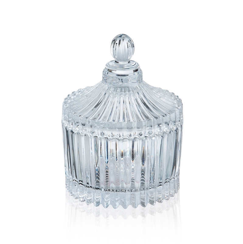 Γυάλινη μπιζουτιέρα-φοντανιέρα σερβιρίσματος σε στρογγυλό σχήμα και γραμμωτό σχέδιο. Η περιεκτικότητα της είναι 80ml. Βάση: 6,3cm Διάμετρος: 6,7cm Ύψος: 4,2cm Συνολικό ύψος: 9,4cm