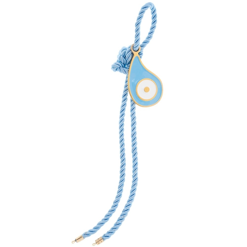 Χειροποίητο κρεμαστό διακοσμητικό γούρι με σιέλ rayon κορδόνι. Είναι στολισμένο με μεταλλικό μάτι δάκρυ σε χρώμα σιέλ.