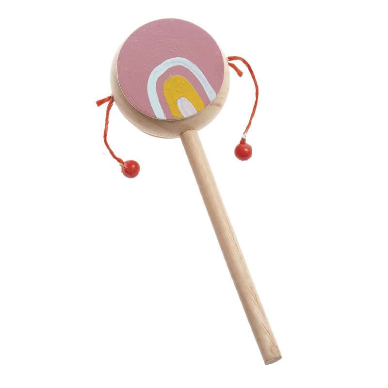 Ξύλινο ζωγραφιστό τυμπανάκι σε βάση αντικέ ροζ και ουράνιο τόξο.