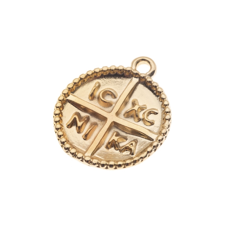 Μεταλλικό χυτό κρεμαστό μοτίφ σε σχέδιο κωνσταντινάτο σε χρυσό χρώμα. Κατάλληλο για την κατασκευή μαρτυρικών. Συσκευασία ανά 250 τεμάχια/σακουλάκι.