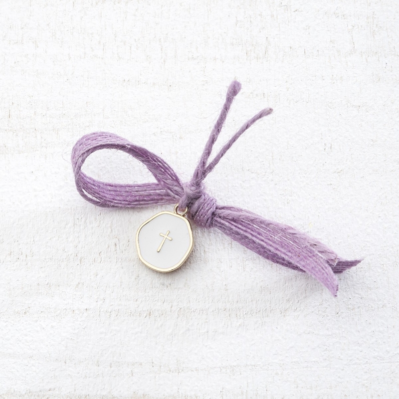 Μαρτυρικό με μεταλλικό στρογγυλό μοτίφ σε χρυσό χρώμα και λευκό σμάλτο.Το δέσιμο είναι σε στυλ μισοφέγγαρου με λιλά κορδόνι γιούτα.