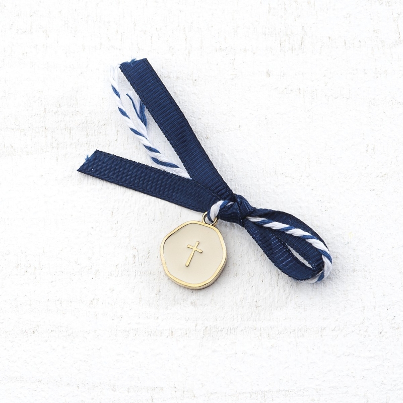 Μαρτυρικό με μεταλλικό στρογγυλό μοτίφ σε χρυσό χρώμα και λευκό σμάλτο.Το δέσιμο είναι σε στυλ μισοφέγγαρου με γκρο κορδέλες σε μπλε ναυτικό χρώμα.