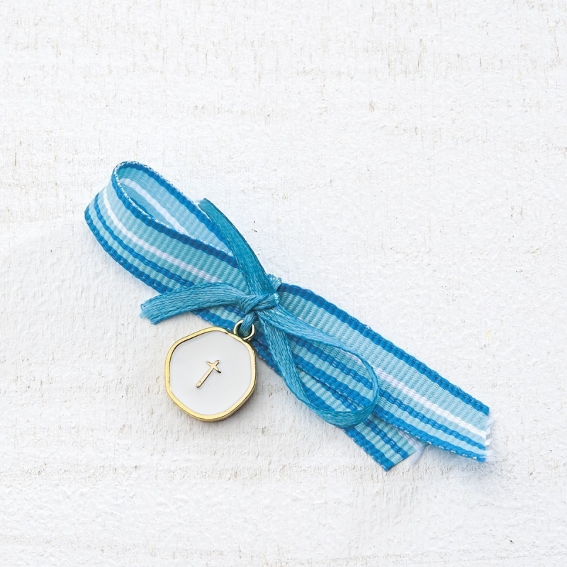 Μαρτυρικό με μεταλλικό στρογγυλό μοτίφ σε χρυσό χρώμα και λευκό σμάλτο.Το δέσιμο είναι σε στυλ μισοφέγγαρου με γκρο κορδέλες σε ριγέ αποχρώσεις του μπλε.