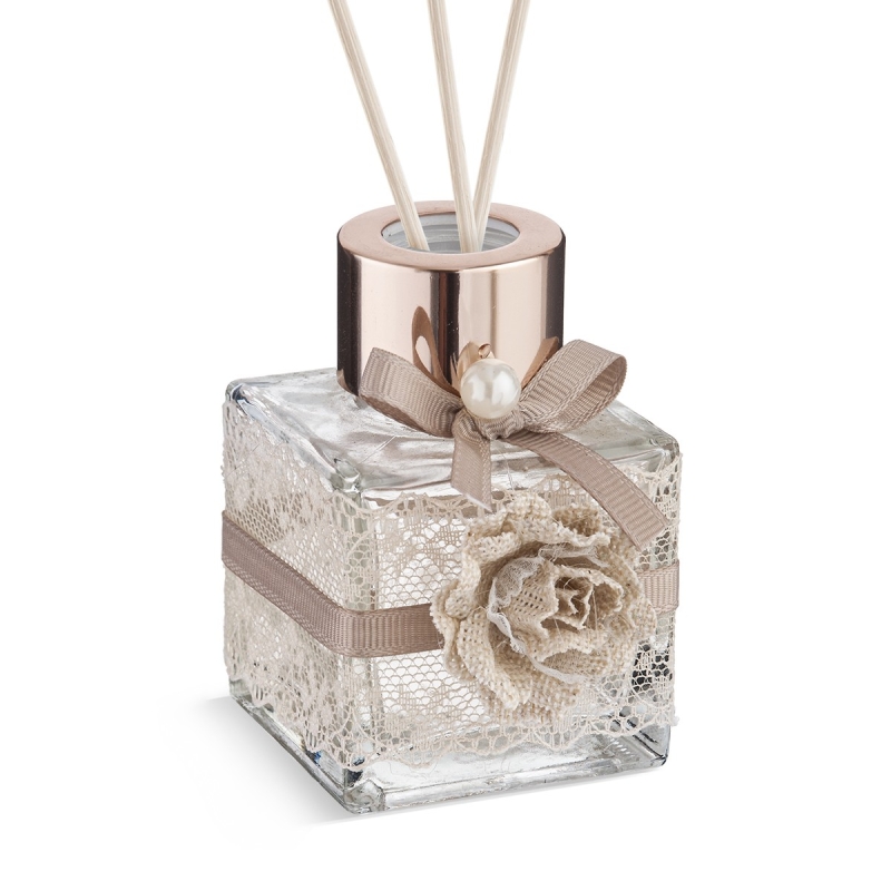 Στολισμένο μπουκαλάκι των 50ml που χρησιμέυει ως αρωματικό χώρου.Το μπουκαλάκι είναι διακοσμημένο με δαντέλα και γκρο κορδέλα σε μόκα-καφέ απόχρωση και εκρού πέρλα. Το στολισμό ολοκληρώνει λουλούδι από γάζα με εξωτερική επένδυση από δαντέλα.