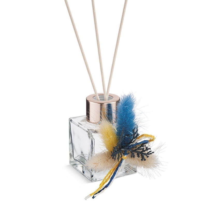 Στολισμένο μπουκαλάκι των 50ml που χρησιμέυει ως αρωματικό χώρου.Το μπουκαλάκι είναι διακοσμημένο μπουκέτο από αποξηραμένα λουλούδια σε μπλε, κίτρινες και εκρού αποχρώσεις.