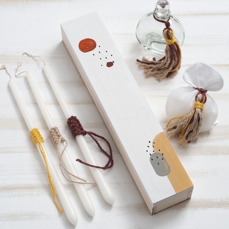 Ξύλινο κουτί συσκευασίας παραλληλόγραμμο ζωγραφισμένο με αφαιρετικά σχέδια σε γήινες αποχρώσεις. Ο κωδικός περιλαμβάνει τα 3 κεράκια, το σαπούνι μέσα σε πουγκάκι και το μπουκάλι του λαδιού.