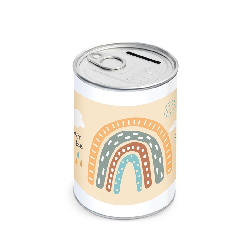 Μεταλλικός κουμπαράς σε σχήμα κονσέρβας. Είναι διακοσμημένο με αυτοκόλλητο print ουράνιο τόξο γήινες αποχρώσεις.