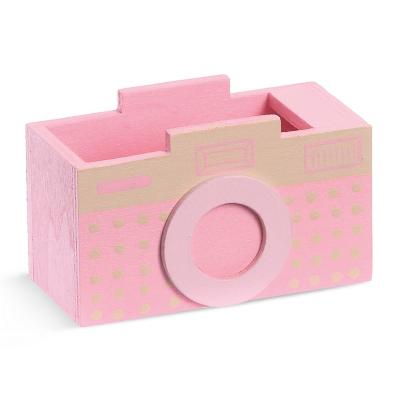 Ξύλινη διακοσμητική μολυβοθήκη σε σχέδιο φωτογραφική μηχανή-photo camera και χρώμα ροζ με καφέ πουά λεπτομέρειες.