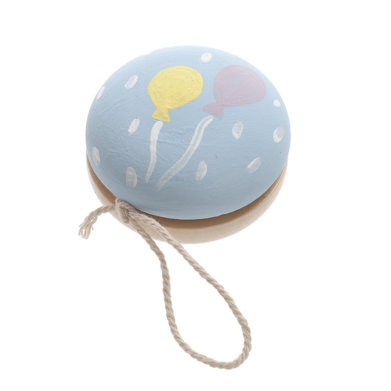 Ξύλινο ζωγραφιστό γιογιό σε βάση σιέλ και μπαλόνια.