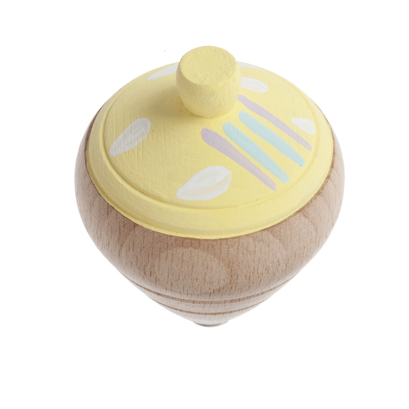 Ξύλινη ζωγραφιστή σβούρα σε βάση κίτρινη και πολύχρωμες γραμμές.