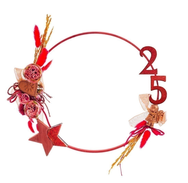 Χριστουγεννιάτικο ξύλινο στεφάνι διακοσμημένο: α) σύνθεση από αποξηραμένα-υφασμάτινα λουλούδια, β)πολυεστερικά διακοσμητικά σε bronze χρώμα και γ) ξύλινα νούμερα σε κόκκινο χρώμα με glitter.