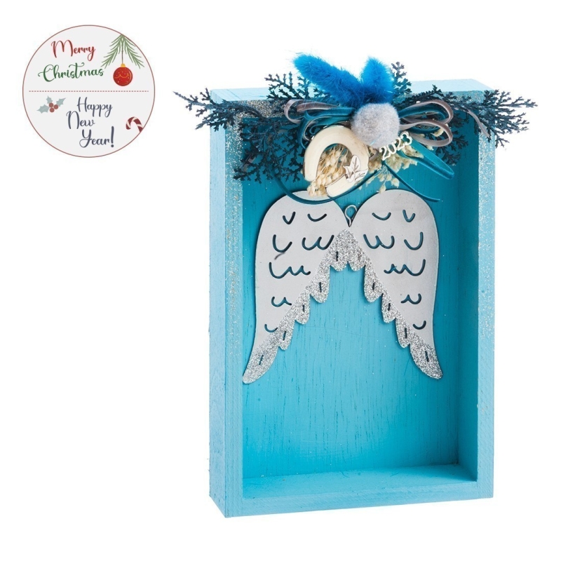 Χριστουγεννιάτικο ξύλινο διακοσμητικό παραλληλόγραμμο καδράκι σε σιελ χρώμα. Το καδράκι στο εσωτερικό είναι διακοσμημένο με ασημί φτερά και στο εξωτερικό με σύνθεση από αποξηραμένα λουλούδια.