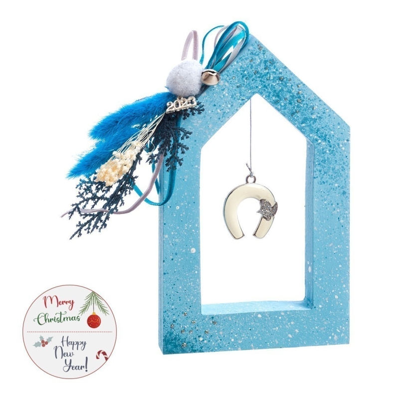 Χριστουγεννιάτικο ξύλινο διακοσμητικό σπιτάκι-πλαίσιο σε σιελ χρώμα. Στο εσωτερικό είναι διακοσμημένο με μεταλλικό πέταλο και στο εξωτερικό με σύνθεση από αποξηραμένα λουλούδια.