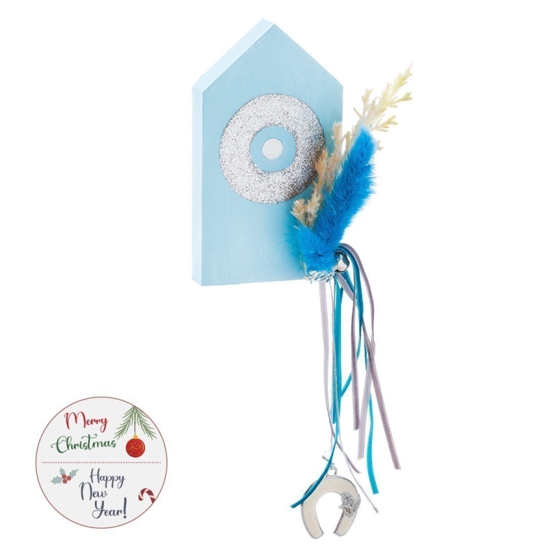 Χριστουγεννιάτικο ξύλινο διακοσμητικό σπιτάκι σε σιελ χρώμα με ζωγραφιστό ασημί μάτι. Είναι διακοσμημένο με σύνθεση από αποξηραμένα λουλούδια.