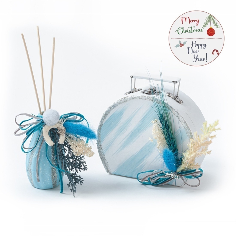 Xριστουγεννιάτικο σετ δώρου που περιλαμβάνει: α)πορσελάνινο βαζάκι σε σιελ χρώμα με ασημί glitter σβησίματα και στολισμένο με αποξηραμένα-υφασμάτινα λουλούδια και β) χάρτινο λευκό βαλιτσάκι με σιελ και ασημί glitter σβησίματα.