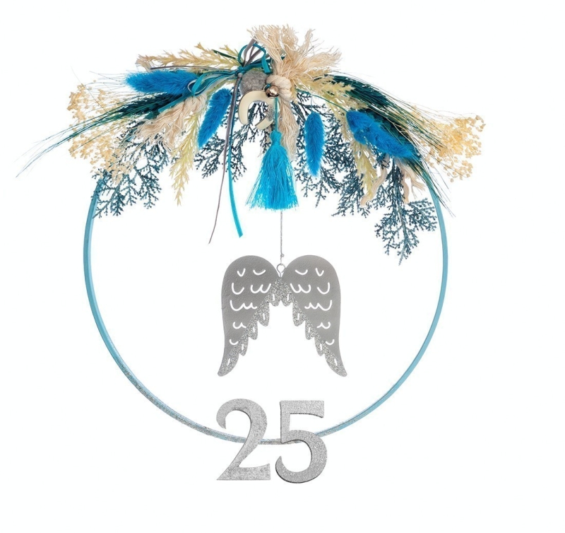 Χριστουγεννιάτικο ξύλινο στεφάνι διακοσμημένο: α) σύνθεση από αποξηραμένα-υφασμάτινα λουλούδια σε σιελ, λευκές και μπλε αποχρώσεις, β)μεταλλικά φτερά σε ασημί χρώμα και γ)ξύλινα νούμερα.