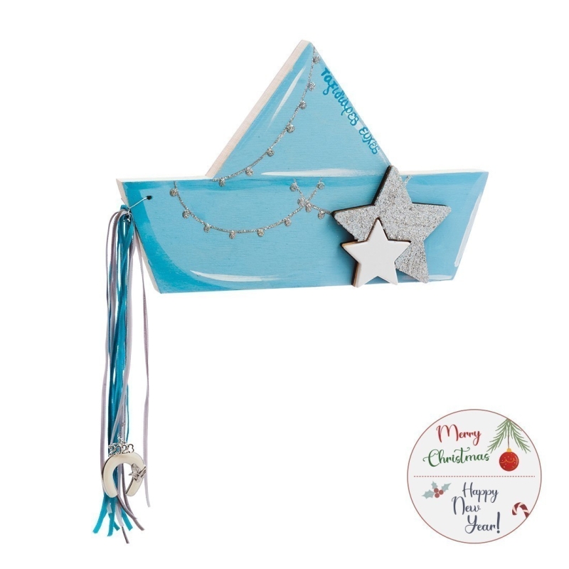 Χριστουγεννιάτικο ξύλινο διακοσμητικό καράβι σε σιελ και ασημί glitter αποχρώσεις, διακοσμημένο με ξύλινο αστέρι.