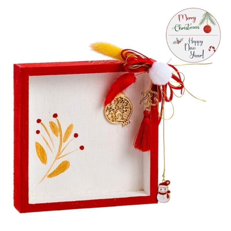 Χριστουγεννιάτικο ξύλινο διακοσμητικό τετράγωνο καδράκι σε λευκό-κόκκινο χρώμα. Το καδράκι είναι διακοσμημένο με σύνθεση από αποξηραμένα λουλούδια.