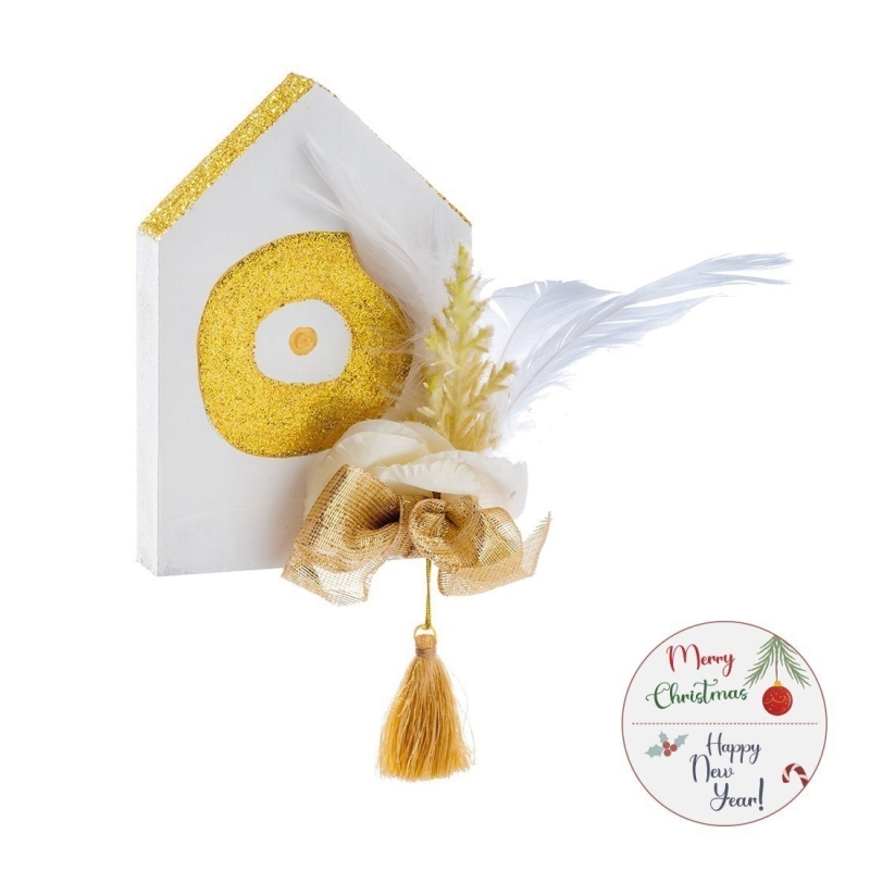 Χριστουγεννιάτικο ξύλινο διακοσμητικό σπιτάκι σε λευκό-χρυσό χρώμα. Το σπιτάκι είναι ζωγραφισμένο με στρογγυλό μάτι και στο εξωτερικό είναι διακοσμημένο από φτερά.