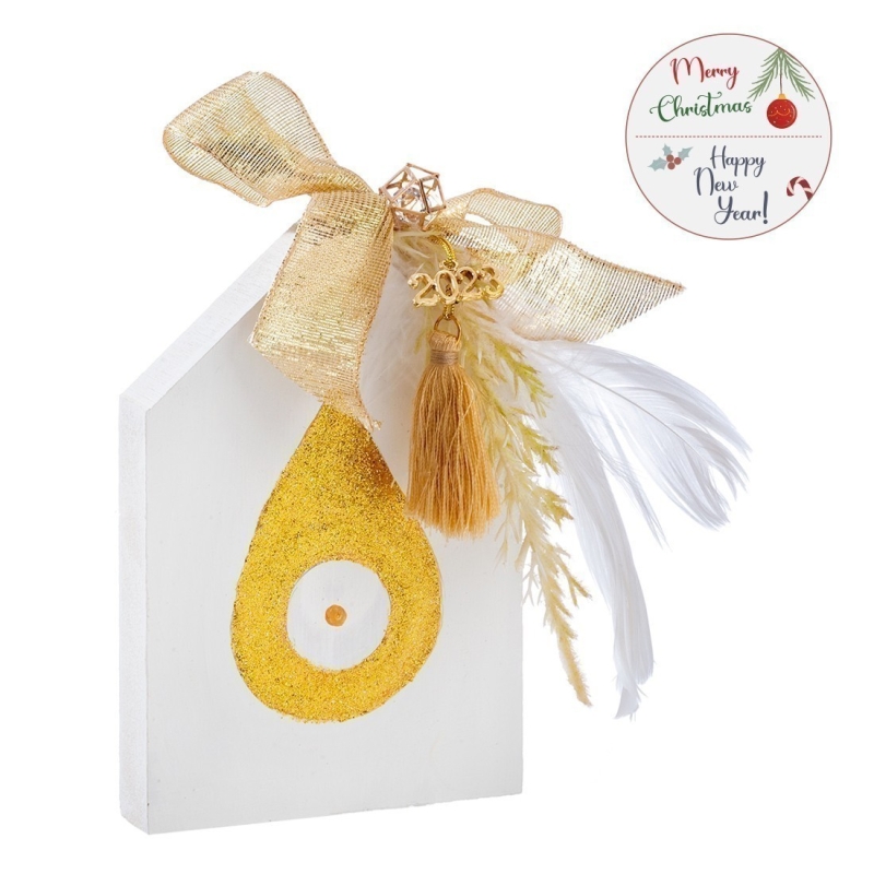 Χριστουγεννιάτικο ξύλινο διακοσμητικό σπιτάκι σε λευκό-χρυσό χρώμα. Το σπιτάκι είναι ζωγραφισμένο με μάτι και στο εξωτερικό είναι διακοσμημένο από φτερά.