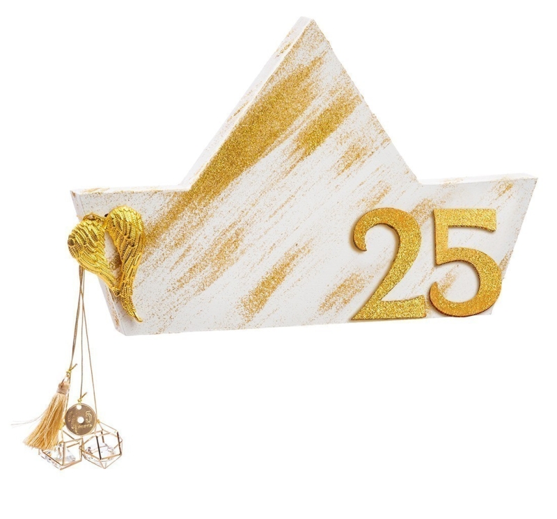 Χριστουγεννιάτικο ξύλινο διακοσμητικό καράβι σε λευκές-χρυσές glitter αποχρώσεις.