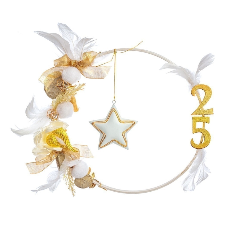 Χριστουγεννιάτικο ξύλινο στεφάνι διακοσμημένο: α) σύνθεση από υφασμάτινα λουλούδια, φτερά, διαμαντάκια, β)μεταλλικό κρεμαστό αστέρι και γ) ξύλινα νούμερα.