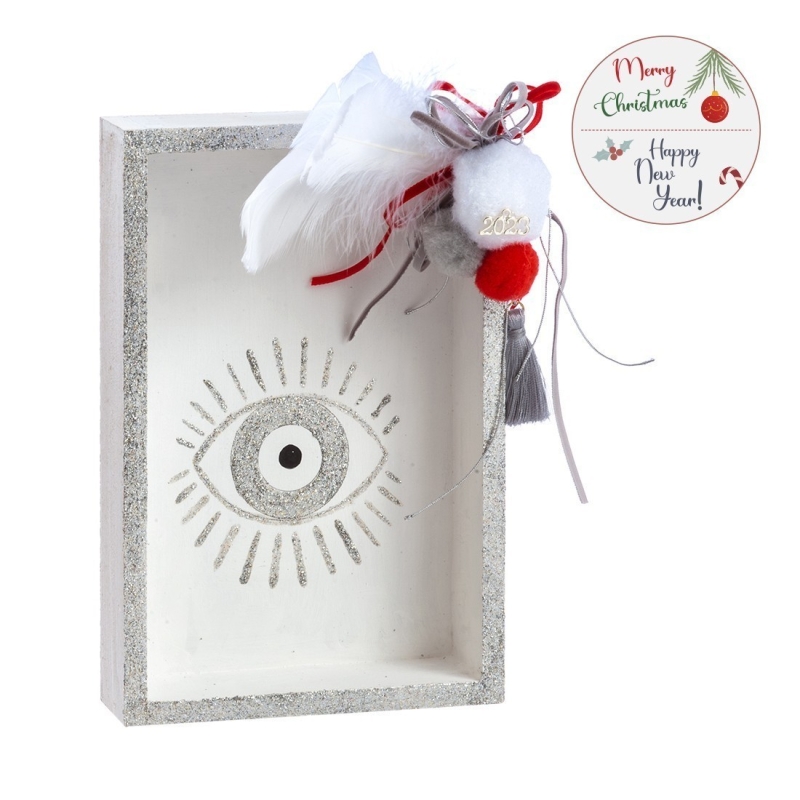 Χριστουγεννιάτικο ξύλινο διακοσμητικό παραλληλόγραμμο καδράκι σε λευκό-ασημί glitter χρώμα. Το καδράκι στο εσωτερικό είναι ζωγραφισμένο με μάτι και στο εξωτερικό είναι διακοσμημένο με σύνθεση από φτερά, pompom .