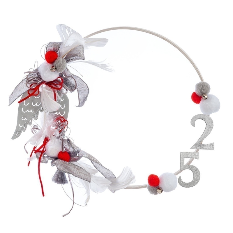 Χριστουγεννιάτικο ξύλινο στεφάνι διακοσμημένο: α) σύνθεση από pompom, φτερά, διαμαντάκια β)μεταλλικό φτερά και γ) ξύλινα νούμερα.