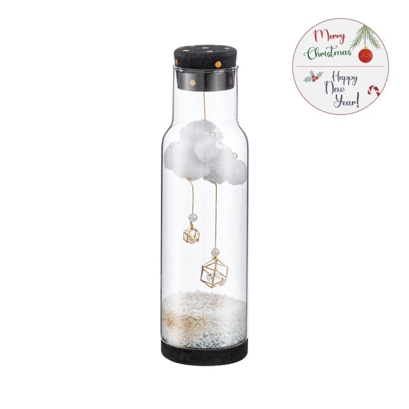 Χριστουγεννιάτικο ψηλό γυάλινο διακοσμητικό με καπάκι από φελλό σε μαύρο χρώμα με χρυσά πουά. Από το καπάκι κρέμονται pop poms με διαμαντάκι εσωτερικά. Στο κάτω μέρος υπάρχει διακοσμητικό χιόνι με glitter χρυσό.