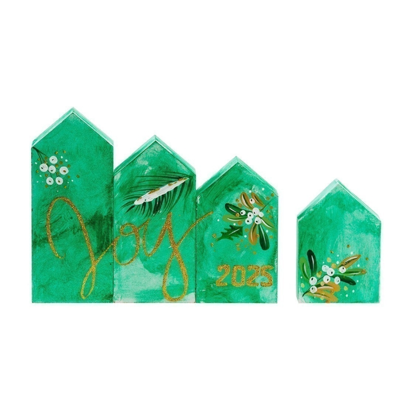 Χριστουγεννιάτικη ξύλινη ζωγραφιστή σύνθεση σε πράσινο χρώμα. Περιλαμβάνει 4 σπιτάκια σε διαφορετικές διαστάσεις. Είναι ζωγραφιστό με διάφορα φυλλώματα και λουλούδια και αναγράφεται η ευχή JOY με χρυσό glitter.