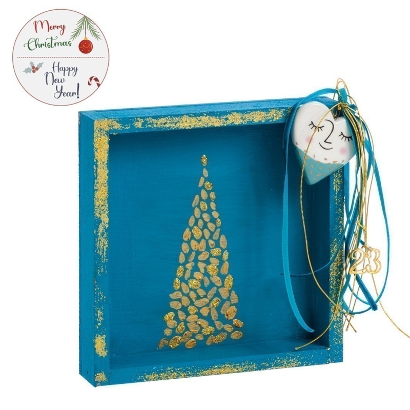 Χριστουγεννιάτικο τετράγωνο καδράκι σε σιελ αποχρώσεις και σβησίματα χρυσά. Είναι στολισμένο με έλατο που σχηματίζεται από φύλλα χρυσού και πορσελάνινη κρεμαστή καρδιά-κόσμημα.