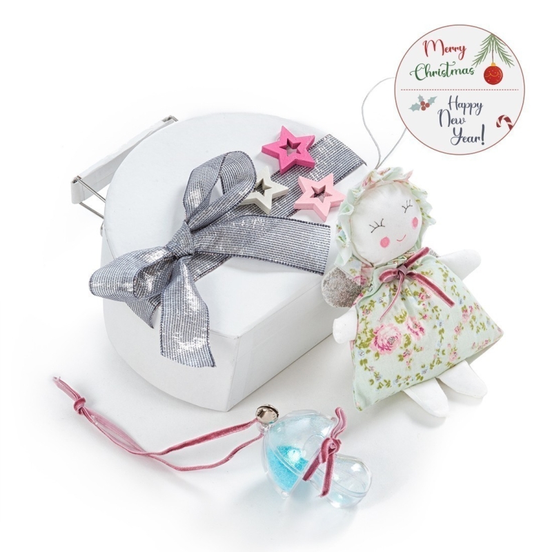 Χριστουγεννιάτικο σετ δώρου που περιλαμβάνει: α)λευκό βαλιτσάκι στολισμένο με ασημί κορδέλα και ξύλινα αστέρια, β)ακρυλικη πιπίλα γεμισμένη με σιέλ glitter και γ)αρωματικό-πάνινο αγγελάκι.