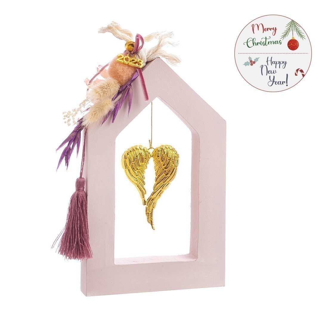 Χριστουγεννιάτικο ξύλινο διακοσμητικό σπιτάκι-πλαίσιο σε ροζ απόχρωση. Στο εσωτερικό είναι διακοσμημένο με μεταλλικά φτερά και στο εξωτερικό με σύνθεση από αποξηραμένα-υφασμάτινα λουλούδια .