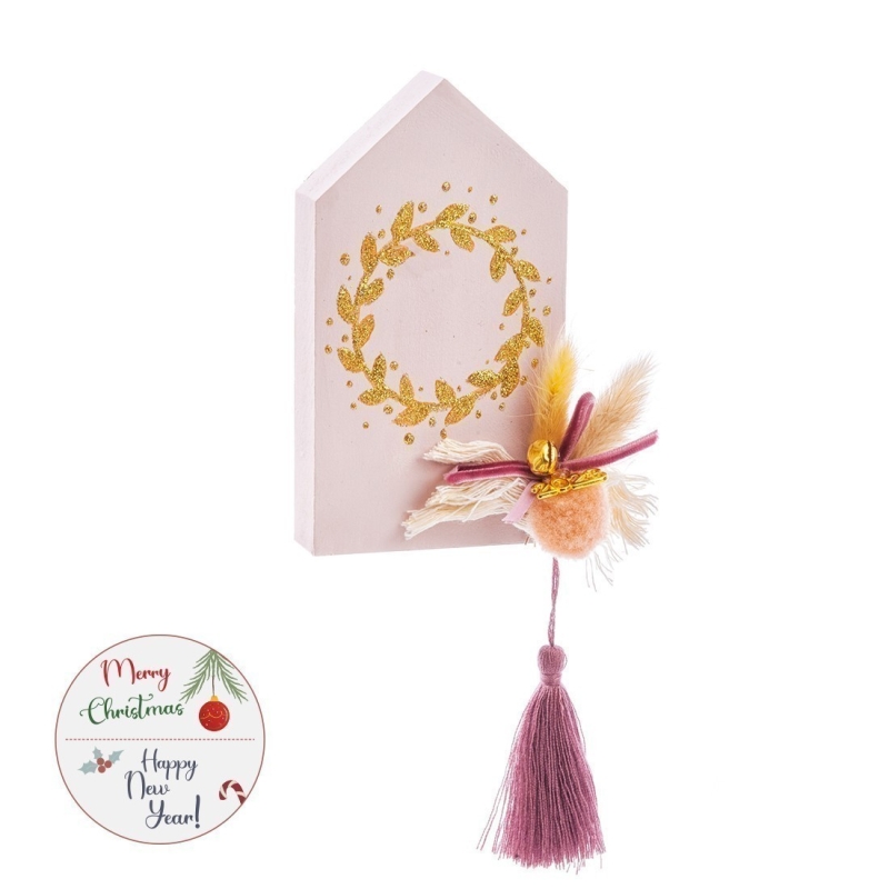 Χριστουγεννιάτικο ξύλινο διακοσμητικό σπιτάκι σε ροζ απόχρωση με ζωγραφιστό στεφάνι σε χρυσό χρώμα. Τη σύνθεση ολοκληρώνει μπουκέτο από αποξηραμένα-υφασμάτινα λουλούδια.