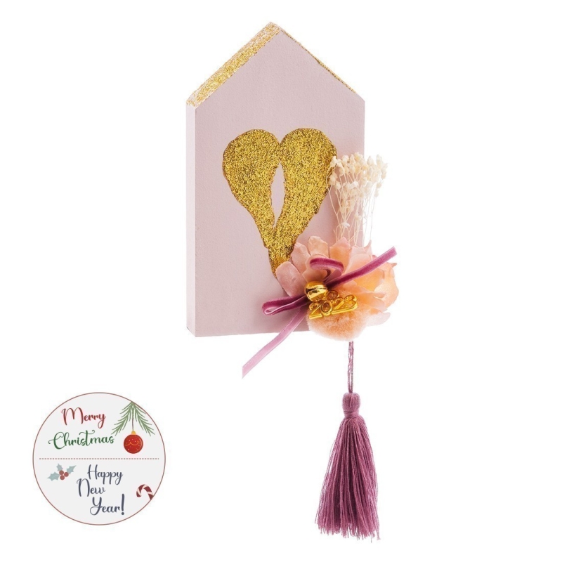 Χριστουγεννιάτικο ξύλινο διακοσμητικό σπιτάκι σε ροζ απόχρωση με ζωγραφιστή καρδιά σε χρυσό χρώμα. Τη σύνθεση ολοκληρώνει μπουκέτο από αποξηραμένα-υφασμάτινα λουλούδια.